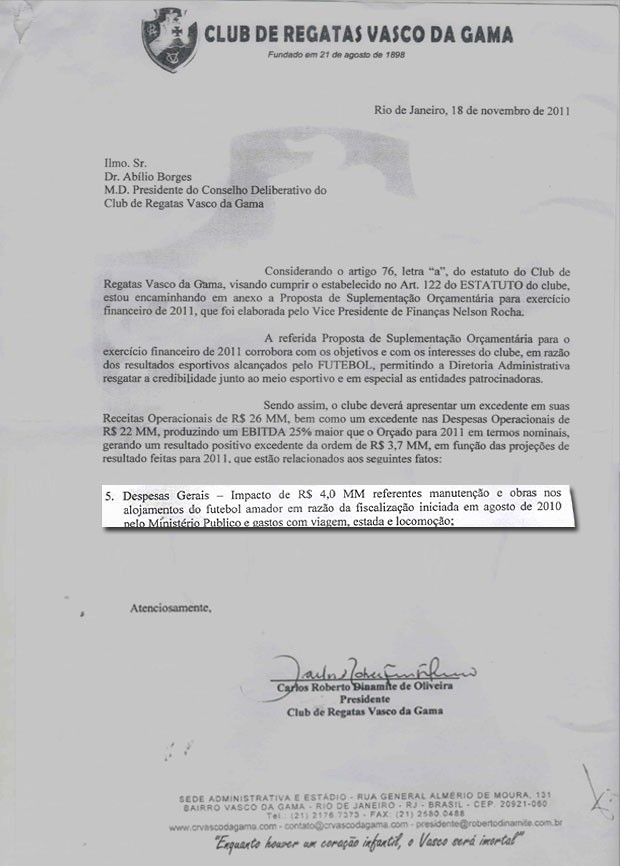 - Quando se faz uma suplementação de verba, é um conserto do orçamento, que previa abaixo ou acima do que estava exposto. Então, na efetivação do orçamento acontecem distorções e, para isso, tem essa suplementação e remanejamento de verba para ajustar tudo direitinho e ter um balanço fechado de acordo com esse orçamento. A gente vê mês a mês o que foi gasto, se a papelada está ok, se foi documento idôneo, de todas as despesas do Vasco. Vemos milhares de notas por mês e verificamos tudo. Se houve um gasto, passou por nós. Não vamos lá no local para ver se foi feita a obra ou o gasto, até porque é impossível o conselho fiscal ver todos os gastos do Vasco e verificar se foi isso realmente. Isso é a parte lá com o Nelson Rocha, que é o vice de finanças - declarou.