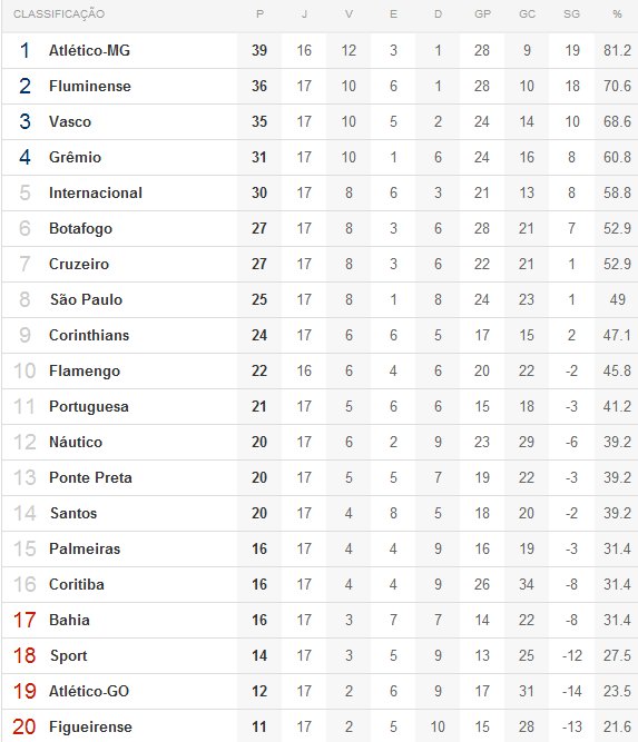 Terminada a 17ª rodada do Campeonato Brasileiro 2012, o Vasco, que empatou com o Coritiba por 2 a 2, continuou na 3ª colocação e segue a 1 ponto do vice-líder Fluminense e 4 atrás do líder Atlético Mineiro, que tem um jogo a menos que seus perseguidores diretos. O Gigante da Colina está pela 17ª rodada seguida dentro da zona de classificação à Copa Libertadores da América.