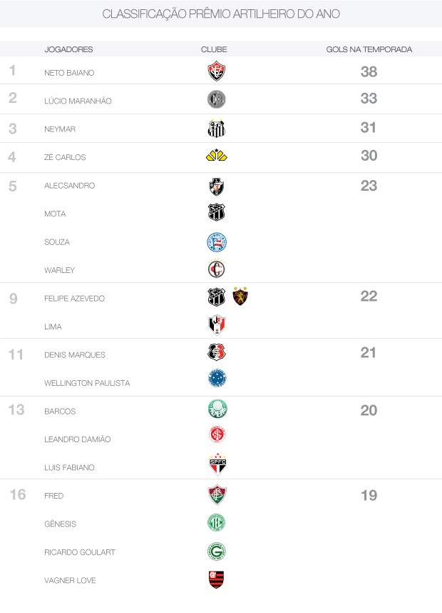 Depois de um bom tempo afastado do território nacional com a seleção brasileira, onde conseguiu a medalha de prata em Londres 2012, Neymar voltou ao Brasil e mostrou que está na briga do Artilheiro do Ano. O atacante do Santos foi muito bem na vitória por 3 a 1 sobre o Figueirense, marcando um dos gols e chegando a 31 no ano. Ele está atrás de Neto Baiano do Vitória, com 38, e de Lúcio Maranhão, do ASA, com 33.