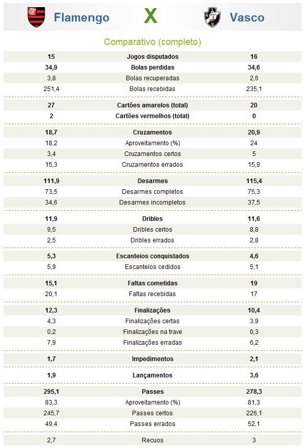Confira o comparativo das estatísticas de Urubu e Vasco no Brasileiro