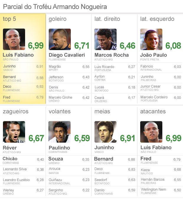 A liderança geral permanece com Luis Fabiano, que há cinco rodadas desfalca o São Paulo e, com isso, se beneficia por não alterar sua média. Juninho Pernambucano e Bernard se mantém com os melhores meias. Deco aparece com a quarta melhor média do Brasileirão, com 6,83.