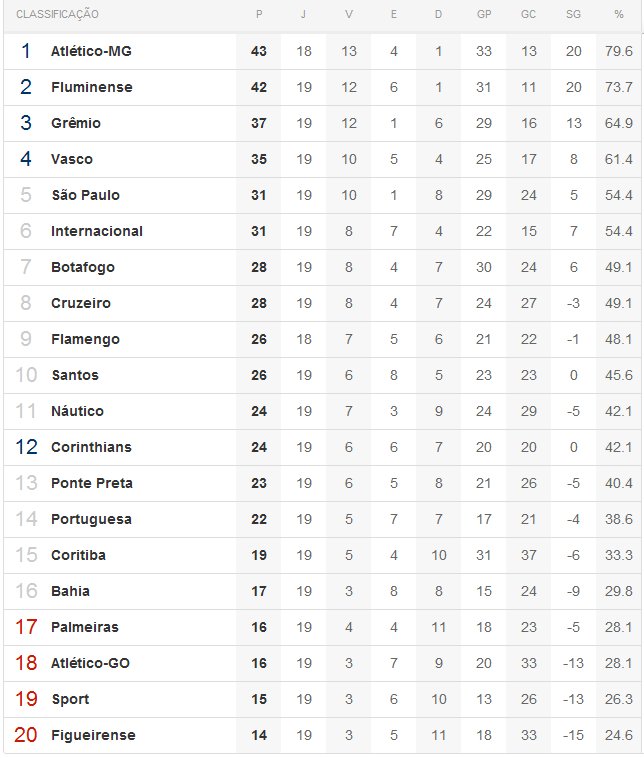 Terminada a 19ª rodada do Campeonato Brasileiro 2012, a última do 1º turno, o Vasco, que perdeu para o Fluminense 2 a 1, caiu para a 4ª colocação. O Vasco está 8 pontos atrás do líder Atlético Mineiro, que tem um jogo a menos que seus perseguidores diretos. O Gigante da Colina está pela 19ª rodada seguida dentro da zona de classificação à Copa Libertadores da América.