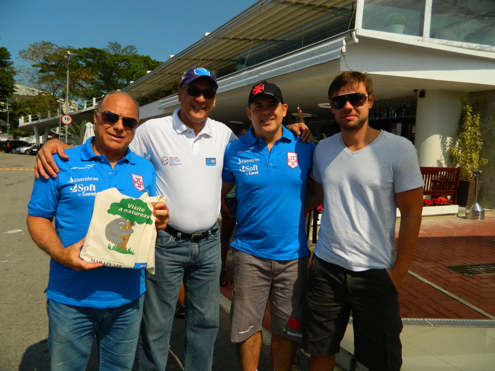 Após a homenagem, o dirigente vascaíno posou para foto com o Secretário de Meio Ambiente do Rio, Altamirando Fernandes, com o médico vascaíno da regata, Robson Luiz e com o diretor executivo do Vasco, Marcos Blanco.