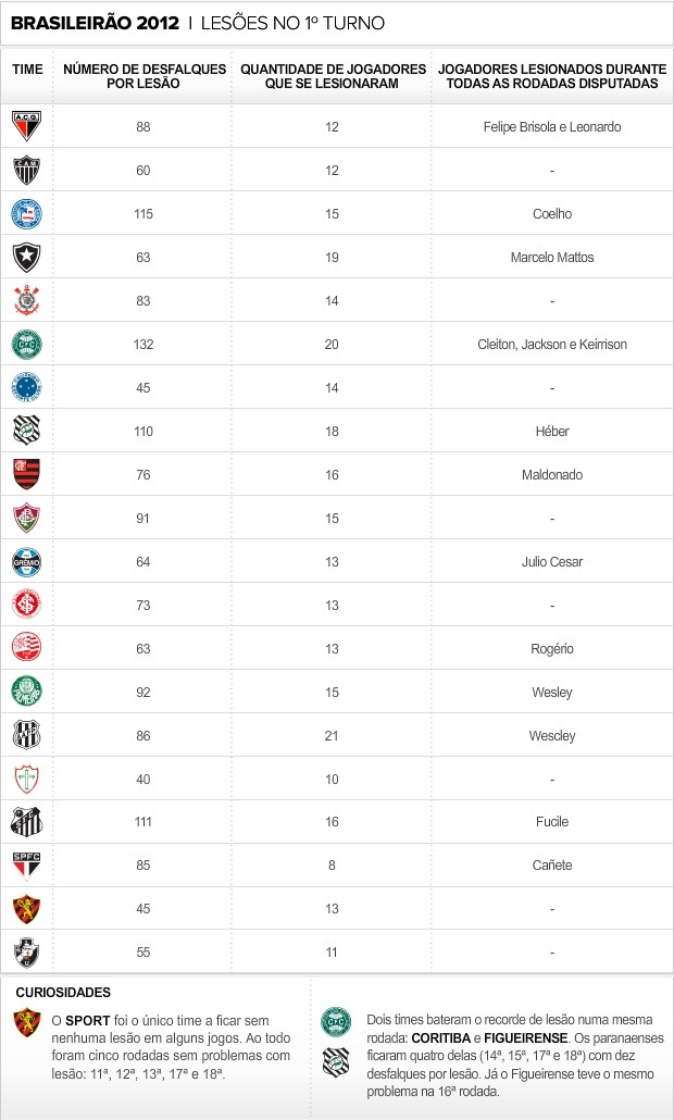Ao todo foram 1.578 desfalques e 289 diferentes jogadores vetados. Os números indicam o tamanho do problema que os treinadores tiveram para escalar suas equipes ao longo do primeiro turno do Campeonato Brasileiro. Todos foram prejudicados de alguma forma com as ausências por lesão. Uns mais, outros menos, e o certo é que, por algumas rodadas, montar a equipe se tornou um verdadeiro quebra-cabeça. Que o diga Marcelo Oliveira, do Coritiba, que chegou a não poder contar com dez jogadores por este motivo em quatro rodadas diferentes. No fim das contas, o treinador teve 132 ausências (contabilizando quantas vezes cada atleta desfalcou a equipe) para suprir na equipe.
