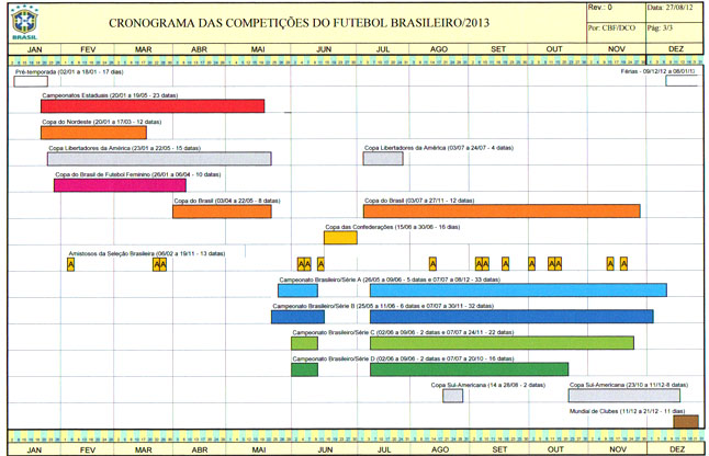 A CBF (Confederação Brasileira de Futebol) divulgou nesta terça-feira, em seu site oficial, o calendário do futebol brasileiro para a temporada 2013. A principal novidade foi uma pequena extensão da Libertadores, que terá sua final disputada no dia 24 de julho.