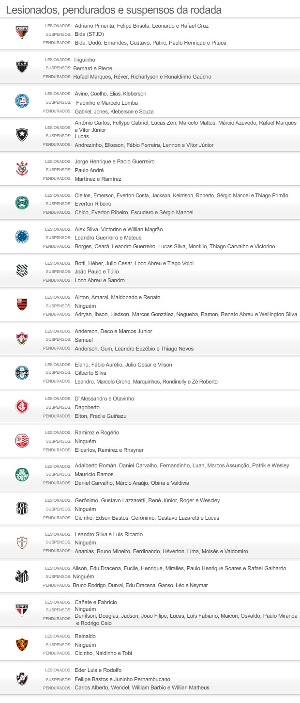 Confira a lista completa de lesionados, suspensos e pendurados para a 20ª rodada: