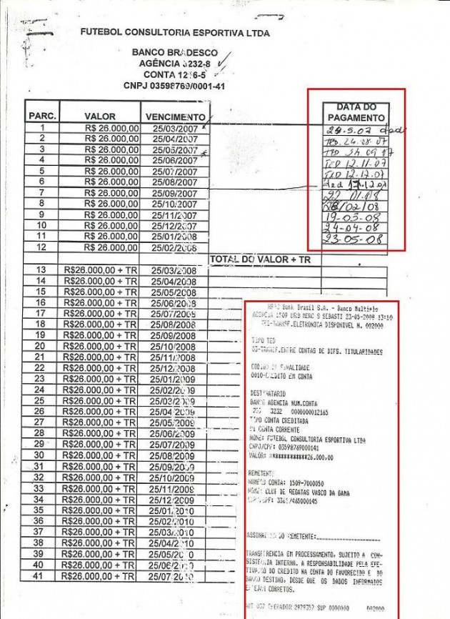 Abaixo, publicamos a planilha de pagamento do acordo celebrado com o atleta Alexandre Torres a respeito das pendências de sua última passagem pelo Vasco. Quando se lê Alexandre Torres, leia-se Futebol Consultoria Esportiva Ltda., a empresa que representava o jogador. Ao lado esquerdo de quem lê, o valor das cotas de tal acordo. Do lado direito, as datas em que foram honrados os pagamentos, bem como o boleto do TED emitido em favor da empresa em 23.05.2008, às 13:10 h, o último pagamento realizado pela Diretoria anterior antes do golpe de junho daquele ano.