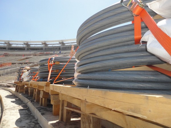 Na madrugada desta sexta-feira, dia 31, chegaram ao local das obras do Maracanã os cabos tencionados que irão sustentar a nova cobertura do Templo do Futebol. Os cabos possuem 20.000 m de comprimento e 110 mm de diâmetro cada, e serão içados por 120 macacos hidráulicos, em um processo chamado de big lift.