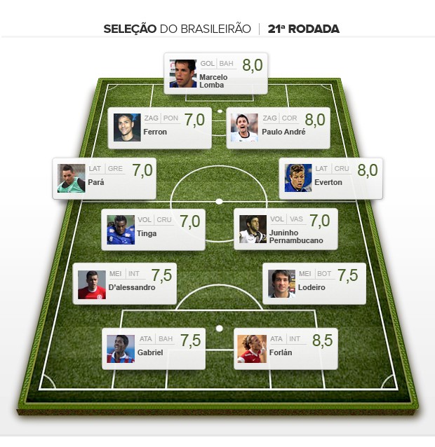 Os criadores de jogada da seleção da rodada falam espanhol. O argentino D'Alessandro voltou ao Inter após longo tempo no estaleiro e orquestrou os principais lances de perigo do Colorado. No terceiro gol da equipe gaúcha, o camisa 10 fez bela jogada e carimbou a trave antes de Forlán marcar no rebote. Pelo conjunto da obra, faturou a nota 7,5. A mesma de Lodeiro, do Botafogo. Além de cobrar o escanteio que originou o gol de cabeça de Elkeson, o uruguaio iniciou e finalizou a jogada do segundo, num carrinho de puro oportunismo. Hugo (Sport) saiu-se bem nesta 21ª rodada e ajudou a sua equipe a triunfar diante do Santos por 2 a 1.