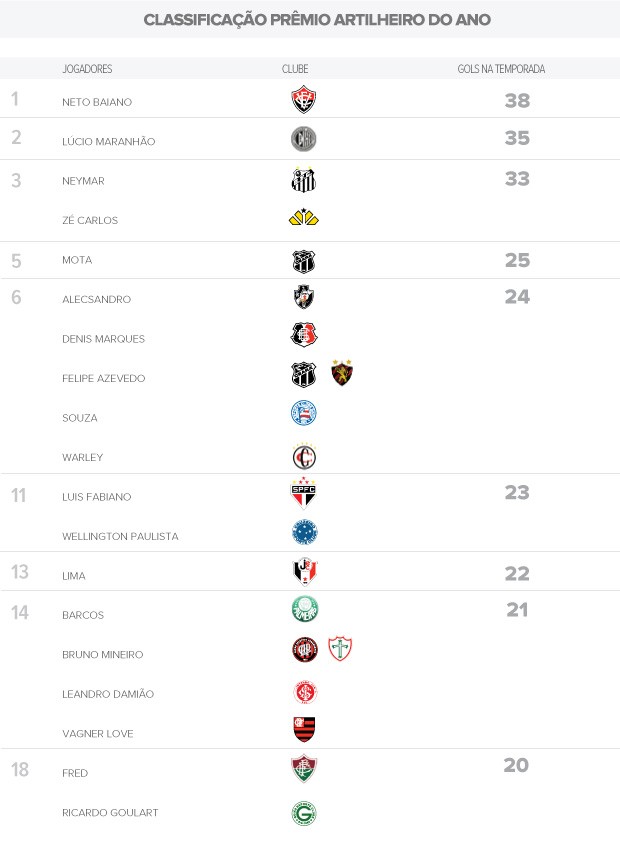 Lúcio Maranhão, segundo colocado no ranking, não balançou as redes do lanterna Barueri na derrota do ASA fora de casa. O homem-gol do time alagoano manteve a diferença três gols para o líder Neto Baiano, ex-Vitória.Alecsandro voltou a marcar e ajudou o Vasco a bater a Portuguesa em São Januário. O camisa 9 do Cruzmaltino ganhou uma posição e está em 6º.