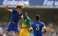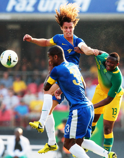 Sem ter nada a ver com isso, a África do Sul, que parecia jogar por uma bola, foi para a cima e teve ótima chance com o lateral Gaxa. Ele fez boa jogada no ataque e chegou à cara de Diego Alves, mas não conseguiu vencer o goleiro brasileiro.
