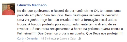 No dia que quebramos o Record de permanência no G4, tomamos uma porrada em pleno São Januário. Nem desfalques servem de desculpa. Uma vergonha. Hoje foi tudo errado, desde a formação inicial até as trocas. A torcida protesta pois apaixonadamente tem o direito de se revoltar. Só nos resta recuperarmos a honra na próxima quarta contra o Palmeiras!!!!! Que Deus nos proteja na quarta. Que Deus nos proteja!!!!!