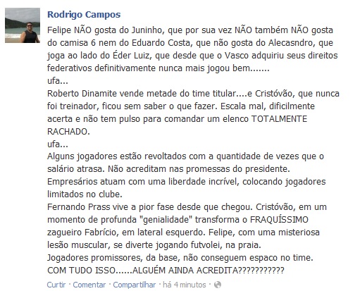 Felipe NÃO gosta do Juninho, que por sua vez NÃO também NÃO gosta do camisa 6 nem do Eduardo Costa, que não gosta do Alecasndro, que joga ao lado do Éder Luiz, que desde que o Vasco adquiriu seus direitos federativos definitivamente nunca mais jogou bem.......