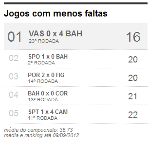 O Bahia por sinal, aparece em três dos cinco jogos com menos faltas da competição. Na segunda rodada, na derrota diante do São Paulo (1 a 0), o jogo teve somente 20 infrações. Na 13ª rodada, no empate sem gols diante do Corinthians, em Pituaçu, foram 21 faltas.