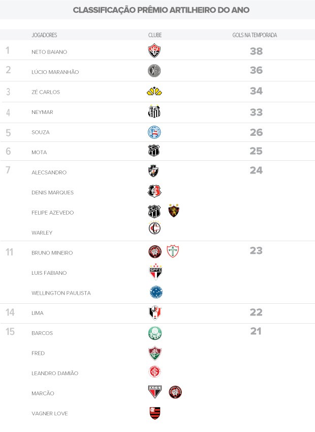 Os favoritos no prêmio Artilheiro do Ano passaram em branco e não conseguiram diminuir a diferença para o líder Neto Baiano, ex-Vitória. Lúcio Maranhão esteve em campo pelo ASA, mas não balançou as redes do Boa Esporte no triunfo mineiro por 3 a 2. Principal goleador da Série B com 20 gols, Zé Carlos está lesionado e fez falta ao ataque do Tigre, que foi derrotado pelo América-MG por 4 a 0. Com a seleção brasileira, Neymar não defendeu o Santos contra o São Paulo, e o Peixe ficou no 0 a 0.