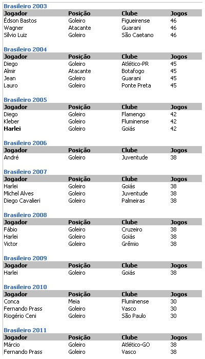 Até hoje, apenas um jogador conseguiu atuar em todas as partidas por três campeonatos brasileiros consecutivos: o goleiro Harlei, pelo Goiás, em 2007, 2008 e 20009. Com mais seis jogos no final do Brasileiro de 2006, Harlei conseguiu acumular um total de 120 jogos seguidos pela série A. Para que Fernando Prass supere essa marca, ele teria que jogar todas as 14 partidas restantes de 2012 e mais 7 no início da série A de 2013. Bem provável.