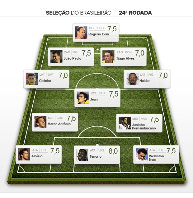 Fundamental para o Vasco na vitória contra o Palmeiras, Tenorio fez um gol e deu uma assistência para tento de Juninho Pernambucano. Como ninguém nesta rodada fez dois gols, a atuação do eqautoriano ganhou ainda mais destaque. Aloísio, do Figueirense, e Wellington Nem, do Fluminense, completam o ataque. Rápido e letal, o atacante do Figueira mostrou muito oportunismo. O avante chegou na jogada antes de Leandro Guerreiro e cabeceou com firmeza para marcar o segundo do clube catarinense, que venceu o Cruzeiro. Pela segunda vez consecutiva, a joia do Tricolor está na seleção do rodada. O jovem valor do Flu aproveitou o vacilo de zagueiro Gustavo, da Portuguesa, roubou a bola, driblou o goleiro Dida e ampliou para a equipe carioca, que segue na liderança isolada. Kleber (Grêmio), Deivid (Coritiba), Victor Andrade (Santos) marcaram e receberam boas notas.