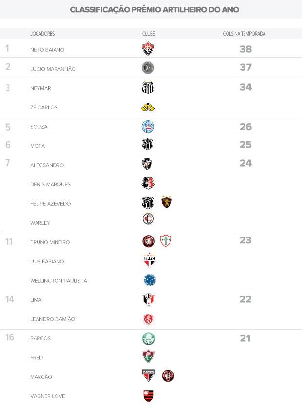 Com um gol de Lúcio Maranhão aos 45 minutos do segundo tempo, o ASA derrotou o Joinville por 1 a 0, na última terça-feira. Segundo colocado do ranking, o camisa 9 do Fantasma vem despontando nesta temporada e também pode bater o recorde geral assinalado por Neymar, do Santos, e Jonas, ex-Grêmio, em 2010, com 42 tentos cada. Aliás, o atacante santista deixou sua marca na vitória do Peixe sobre o Fla por 1 a 0, assumindo o terceiro lugar, ao lado de Zé Carlos, do Criciúma, que passou em branco na derrota de sua equipe para o Goiás (1 a 0).