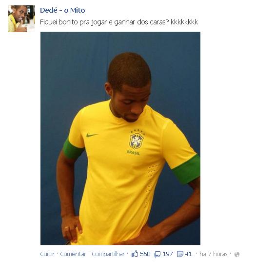 No Facebook, Dedé posa com a camisa da Seleção e pergunta se está bonito