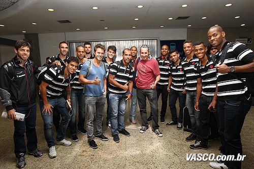O elenco do Vasco encontrou, neste sábado, Nado Grimberg no aeroporto. O ator interpreta o vascaíno fanático Ruço na novela ‘Cheias de Charme’. Assim como seu personagem, Nado também é vascaíno.