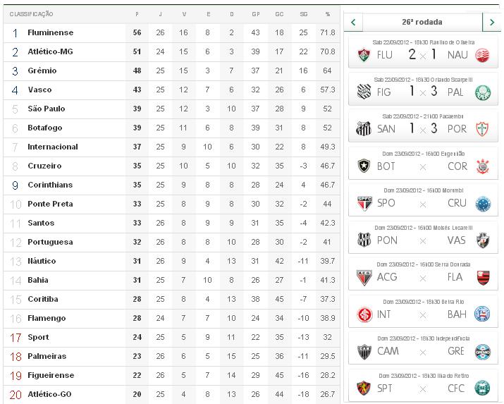 Três jogos abriram a 26ª rodada do Campeonato Brasileiro. O Fluminense derrotou o Náutico e segue líder independente dos resultados do domingo, que terá, além de Ponte Preta x Vasco, o duelo entre Atlético-MG e Grêmio, respectivamente o 2º e o 3º colocados.