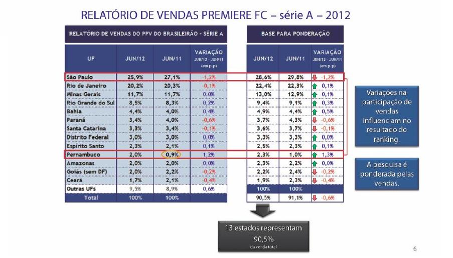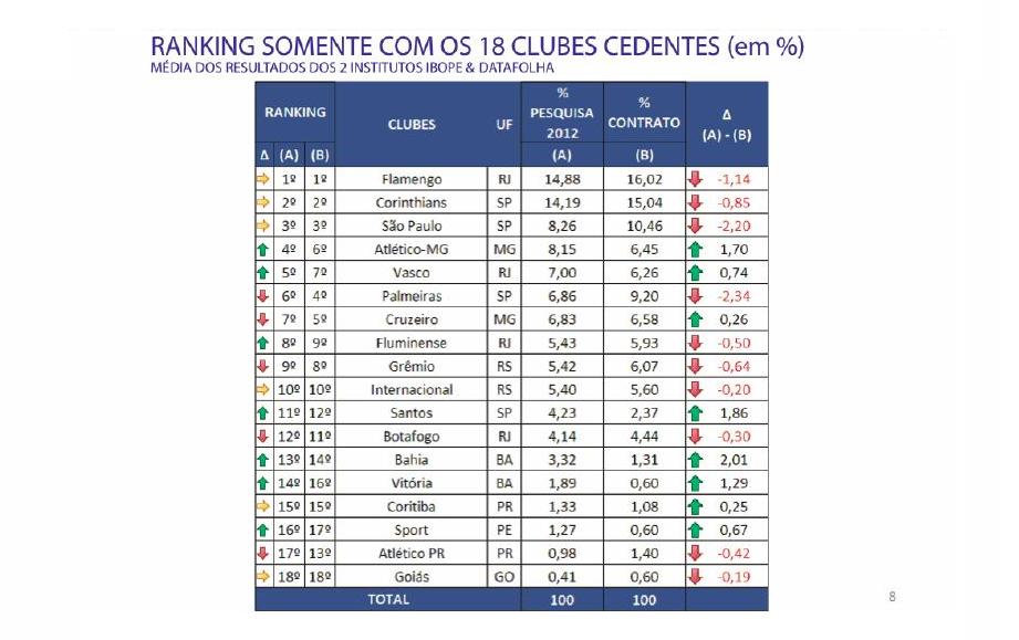É importante ressaltar que os números são fruto da média aritmética de duas pesquisas encomendadas pela Globosat ao Datafolha e ao Ibope. Após a mensuração das torcidas dentro da base de assinantes, os percentuais balizam a distribuição dos recursos na temporada seguinte. Ao lado da coluna “% Pesquisa 2012” existe outra denominada “% Contrato”. Tratam-se de percentuais próximos (ainda que não idênticos) aos da pesquisa de 2011, sugerindo negociações firmadas em torno daqueles números.