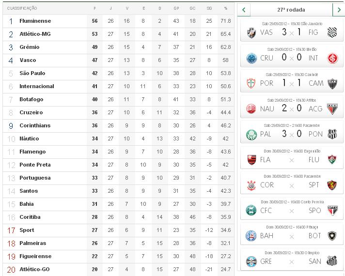 Além do Vasco, 4º colocado, que venceu o Figueirense, o vice-líder Atlético-MG também entrou em campo neste sábado (29/09), empatando com a Portuguesa. O líder Fluminense, o 3º colocado Grêmio e o 5º colocado São Paulo jogam no domingo (30/09).