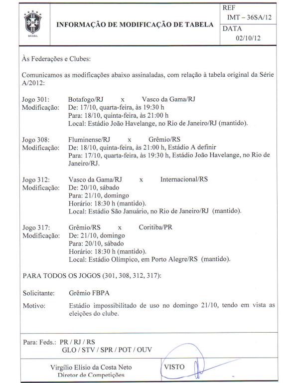 Eleições do Grêmio fazem CBF alterar data de 2 jogos do Vasco