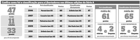 A CBF errou feio ao distribuir as vagas da Libertadores. Só tem três garantidas neste Brasileiro. A chance do Vasco será mínima se o São Paulo ganhar a Sul-Americana. Sendo assim, ele precisará alcançar o G3, com aproximadamente 70 pontos. Atualmente, a equipe possui 22% de chances. Se a classificação ficar no G4, a porcentagem sobe para 61%, sendo necessários cerca de 66 pontos para se garantir entre os classificados. A campanha do Vasco é boa, mas a dificuldade cresceu. O Flu possui o mesmo desempenho do São Paulo de 2007, mas o segundo e o terceiro colocados são recordistas de pontuação.