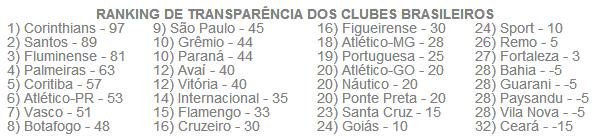O ranking foi baseado em 14 critérios, como disponibilidade do balanço no site oficial do clube, o histórico da publicação dos balanços, se o clube disponibiliza a posição dos auditores e se publica renatório anual e Política de Governança, bem como o estatuto do clube, entre outros pontos.