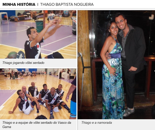 "Meu nome é Thiago Baptista Nogueira, tenho 23 anos, solteiro e moro na cidade do Rio de Janeiro. Sou formado em Técnico de Edificações, mas atualmente estou parado pelo INSS com auxílio acidente de trabalho. Sempre fui muito ativo, praticava diversas atividades físicas, como natação, judô, vôlei, musculação e futsal. Mas, no dia 13 de junho de 2008, sofri um acidente de trem na estação de Madureira (zona norte do Rio), quando voltava do trabalho. Tive amputados a minha perna direita e meu pé esquerdo. Apesar da gravidade do acidente, fiquei apenas uma semana no hospital. A partir daí, minha vida mudou completamente. Tornei-me uma pessoa sedentária, que necessitava de ajuda até nos afazeres diários, como tomar banho e ir ao banheiro. Para tudo eu precisava de alguém ao meu lado, e isso foi um grande choque na minha vida.
