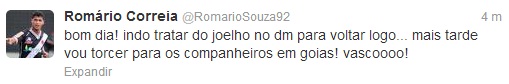 O atacante Romário de 20 anos que nesta semana machucou o joelho em partida contra a Ponte Preta válida pela Copa do Brasil Sub-20, declarou esta manhã através de seu Twitter que fará tratamento em seu joelho hoje no Departamento Médico do Vasco.