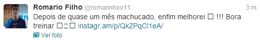 O atacante Romarinho, filho do ídolo Romário declarou nesta tarde através de seu Twitter que já se recuperou da lesão que o deixou afastado dos gramados por 1 mês e que treinará normalmente essa tarde.