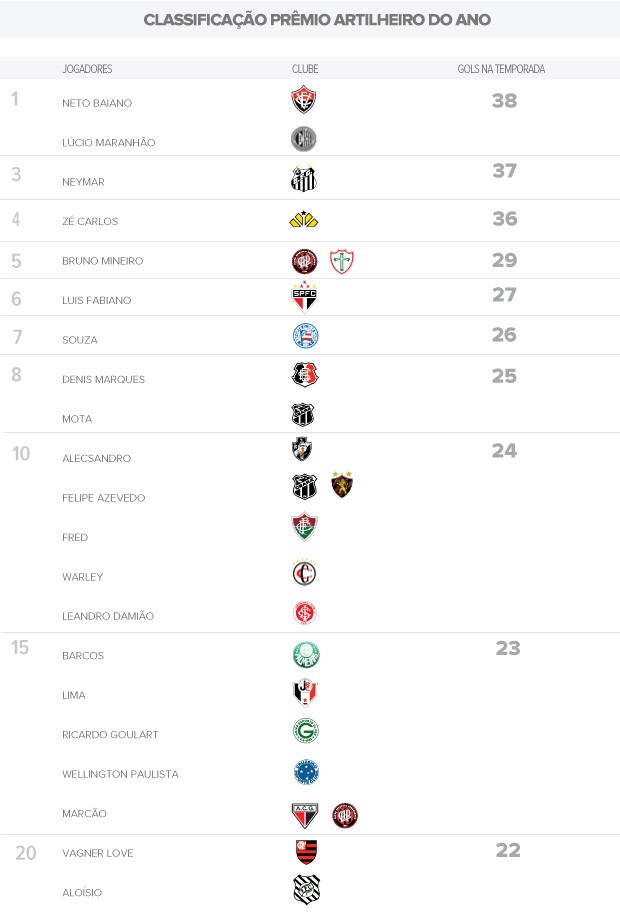 Reta final do Campeonato Brasileiro 2012. A pressão por resultados aumenta a cada rodada. Neste momento decisivo, as equipes concorrentes ao título ou ao acesso depositam as esperanças em seus artilheiros. No entanto, neste meio de semana, os principais candidatos ao prêmio Artilheiro do Ano não foram bem na rodada e passaram em branco. Desta forma, Lúcio Maranhão, do ASA, ainda divide a liderança do ranking com Neto Baiano, ex-Vitória, com 38 gols cada.