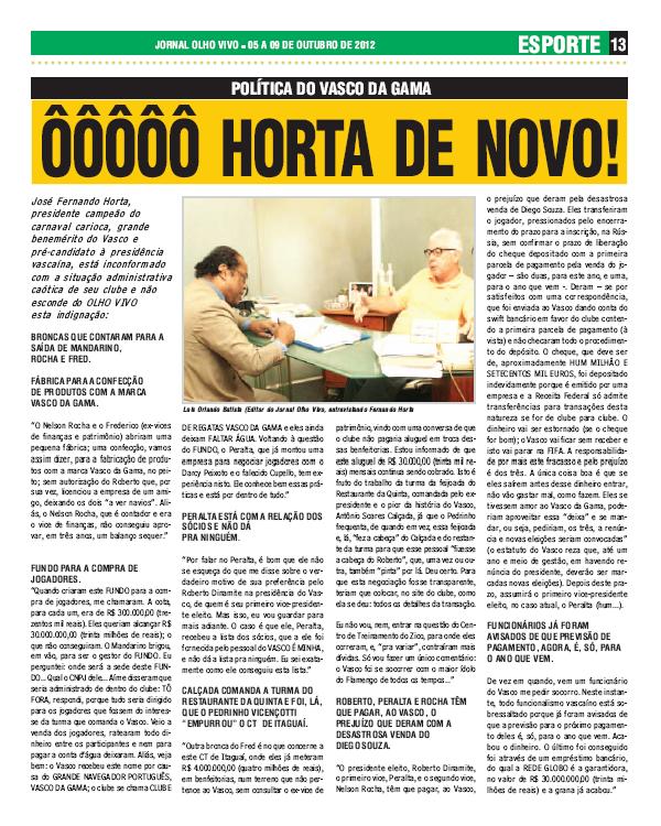 José Fernando Horta, presidente campeão do carnaval carioca, grande benemérito do Vasco e pré-candidato à presidência vascaína, está inconformado com a situação administrativa caótica de seu clube e não esconde do OLHO VIVO esta indignação: