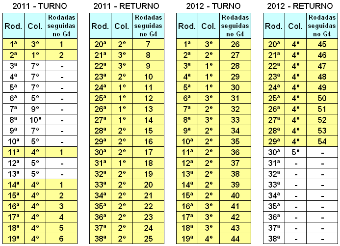 Das 54 rodadas que passou no G4, o Vasco foi líder do Brasileirão em 8, 2º colocado em 21, 3º colocado em 8 e 4º colocado em e 17. Veja, abaixo, a classificação do clube ao fim de cada rodada desde o início do Brasileirão 2011.