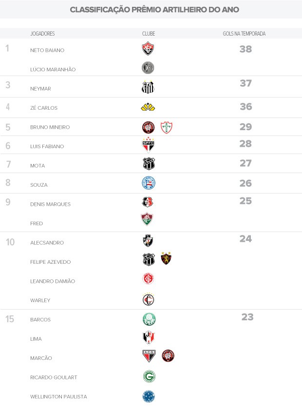 Na última terça-feira, o ASA venceu o Guaratinguetá por 3 a 1. Prato cheio para gols de Lúcio Maranhão, líder do Prêmio Artilheiro do Ano. No entanto, o atacante passou em branco. No sábado, o Criciúma goleou o Boa Esporte por 4 a 0, porém, sem gols do goleador da Série B, Zé Carlos. Enquanto isso, Neymar marcou mais uma vez pela Seleção, o que não ampliou a contagem do "Moicano" na classificação. Com isso, a disputa para o maior número de gols na tempora permaneceu com o mesmo panorama.