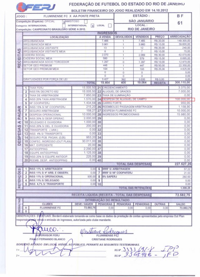Confira no borderô da partida Fluminense x Ponte Preta, na parte destacada em vermelho, a rubrica 'Despesa de aluguel de campo', no valor de 100 mil reais.