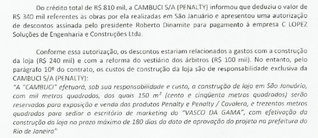 O grande problema é que no contrato com a Penalty, está descrito claramente que a responsabilidade e o custo da obra é total da empresa, não cabendo ao Vasco nenhum ônus com isso. Esse desconto não foi explicado até o momento pelo presidente Roberto Dinamite a nenhum dos poderes do clube. É importante lembrar que tanto as filhas do presidente do Vasco Roberto Dinamite, quanto o ex-VP de Patrimônio Fred Lopes, responsável por fiscalizar a obra, possuem franquias das lojas Gigantes da Colina.