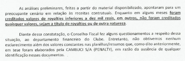 Além disso, o Conselho Fiscal apontou uma série de inconsistências nos valores passados ao clube pela fornecedora de material esportivo, sejam descontos de impostos sem justificativas, sejam de frete muito acima do comum e até depósito do valor de Royalties inferior ao minimo estipulado pelo contrato que é de 75 mil reais/mês. Até a época do parecer, esses valores ainda não haviam sido justificados.