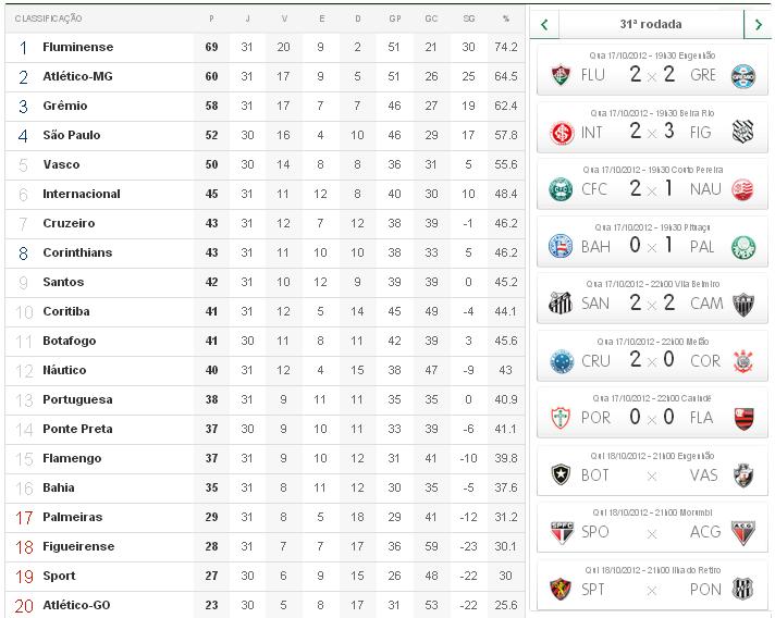 Nos jogos da 4ª-feira (17/10), o líder Fluminense empatou com o 3º colocado Grêmio e o vice-líder Atlético-MG também ficou no empate. O Vasco, 4º colocado, e o São Paulo, 5º colocado, vão a campo nesta 5ª-feira (18/10).