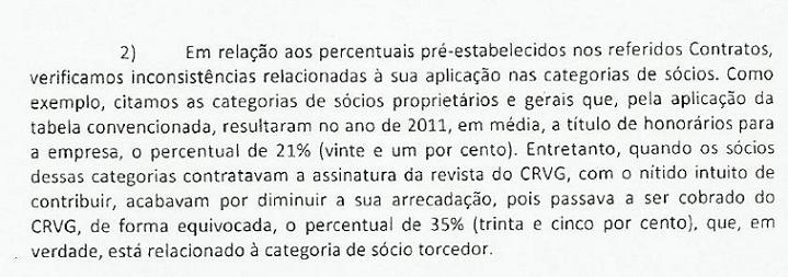 Quando o sócio Geral pagava R$30,00 por mes, restava ao Vasco, depois de subtrair 21% de retenção, a quantia de R$ 23,70 ao Vasco. No entanto, quando ele passava a assinar a revista cuja assinatura era R$ 71,10 por ano, ele pagava R$ 30,00 (mensalidade sócio geral) + R$ 5,92 (assinatura da revista/12) que perfazia a quantia de R$ 35,92. Em cima desse valor, eram retidos inexplicavelmente 35% de honorarios, restando para o clube, R$ 23,34.