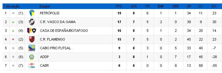Na parte de cima da tabela, nenhuma alteração. Apesar da perda da invencibilidade, o Petrópolis, já classificado para a fase final do Estadual, continua líder isolado com 19 pontos, quatro (Nota da NETVASCO: Na verdade, dois) a frente do Vasco, segundo colocado. O Botafogo aparece em terceiro com 16 pontos, e fechando a zona de classificação vem o Flamengo, com 15.