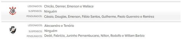 Confira suspensos, lesionados e pendurados de Corinthians e Vasco