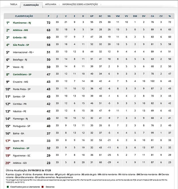 - A contagem do Internacional/RS inclui três pontos correspondentes ao jogo Internacional/RS x Palmeiras/SP, o qual encontra-se sub judice, conforme decisão do STJD, encaminhada à CBF através do FAX No. 1053/2012, de 30/10/12.