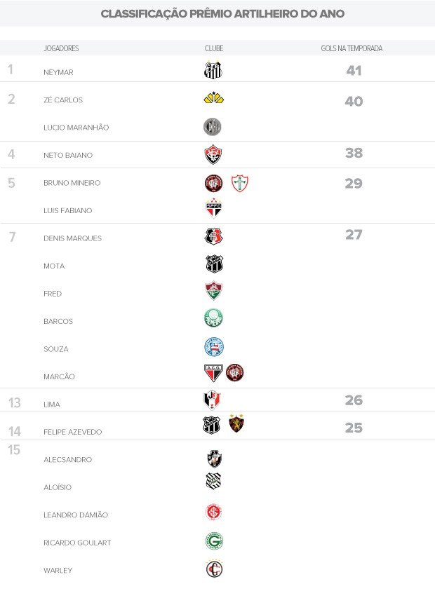 O atacante Neymar, do Santos, não esquecerá tão cedo a vitória do Peixe sobre o Cruzeiro. No último sábado, o jovem teve uma atuação de gala. Autor de três gols e uma assistência, o camisa 11 santista brilhou e foi aplaudido de pé pelos torcedores da Raposa. Com os tentos, Neymar ultrapassou Zé Carlos e Lúcio Maranhão e se isolou na primeira colocação do Artilheiro do Ano com 41 gols. O santista está a um tento de igualar ao próprio recorde. Em 2010, o avante e Jonas, ex-Grêmio, fizeram 42 tentos na temporada.