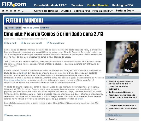 O site da Fifa destacou a possível volta do treinador Ricardo Gomes ao futebol e ao Vasco da Gama. Confira: