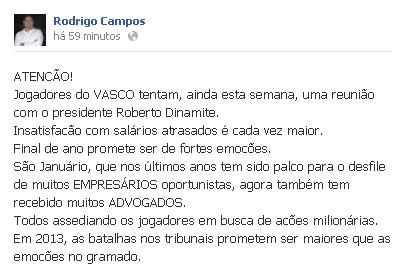De acordo com informações através de sua página no Facebook, o jornalista Rodrigo Campos, da Rádio Manchete, afirmou que a insatisfação no elenco por causa dos atrasos de salário só aumenta e os jogadores exigem uma reunião com o presidente. Confira: