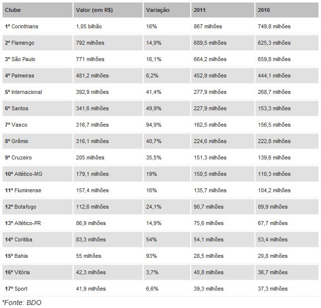 O Corinthians confirmou o status de clube mais valioso do Brasil e foi a primeira agremiação do País a ultrapassar o valor de R$ 1 bilhão na sua marca, se mantendo no topo do estudo realizado pela empresa de consultoria BDO. O time paulista já havia liderado o ranking em 2011 , com valor estimado em R$ 867 milhões, e em 2010, com 749,8 milhões.
