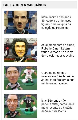E são os ídolos vascaínos que recebem o tratamento especial na coleção. Edmundo, Romário e Roberto Dinamite contam com miniaturas em várias versões de suas respectivas carreiras, sejam jovens e veteranos, jogando com a cruz de malta no peito ou mesmo com outras camisas.